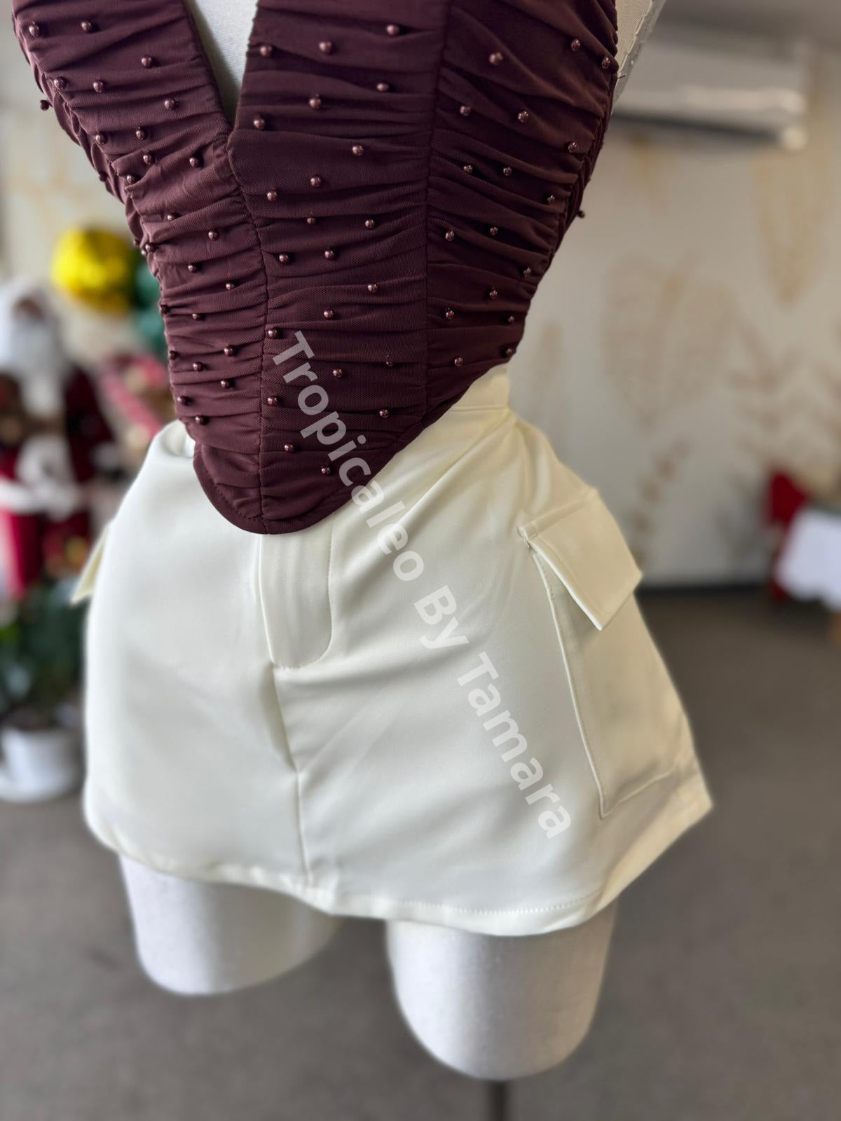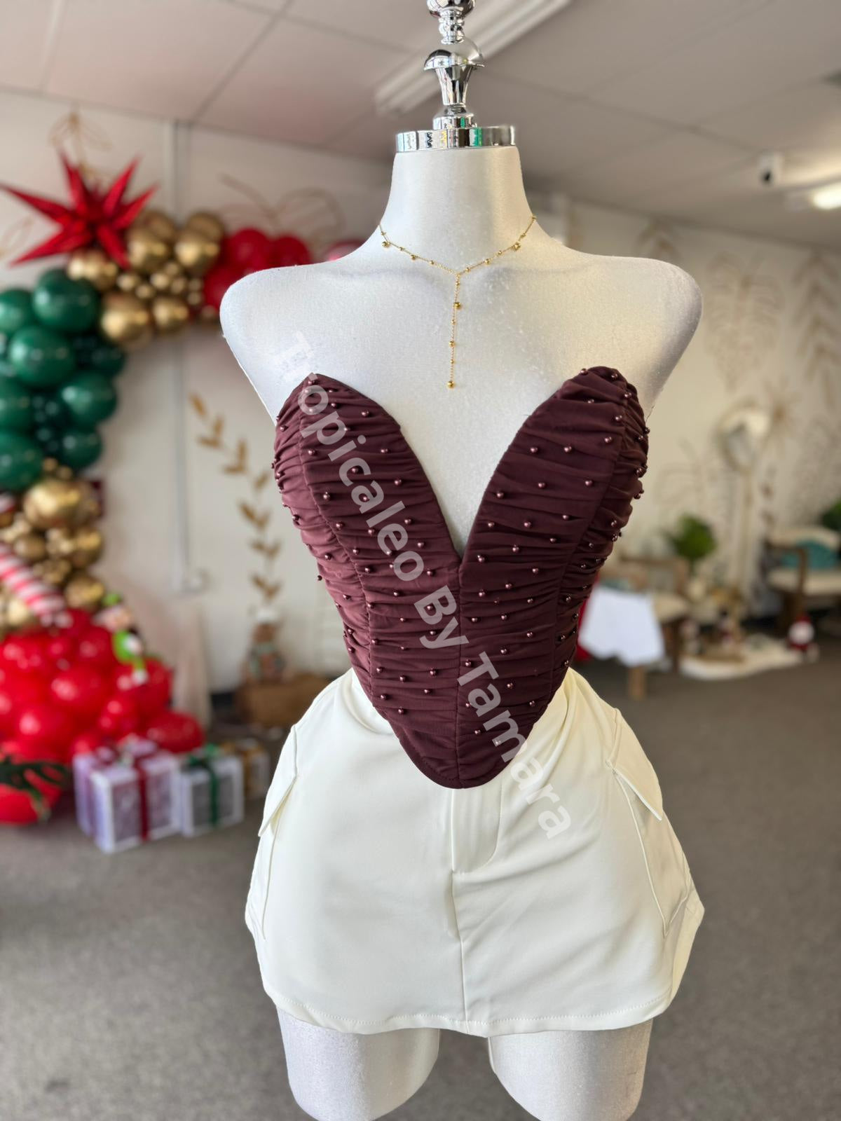¡Levanta tus looks con este top cropped elegante y sofisticado! 👚 Hecho de tela mesh (no transparente), forma corazón y decorado con delicadas perlas que le dan el toque perfecto. 💎 Ideal para lucir un estilo chic y moderno. 💕 El color es tipo burgundy oscuro.