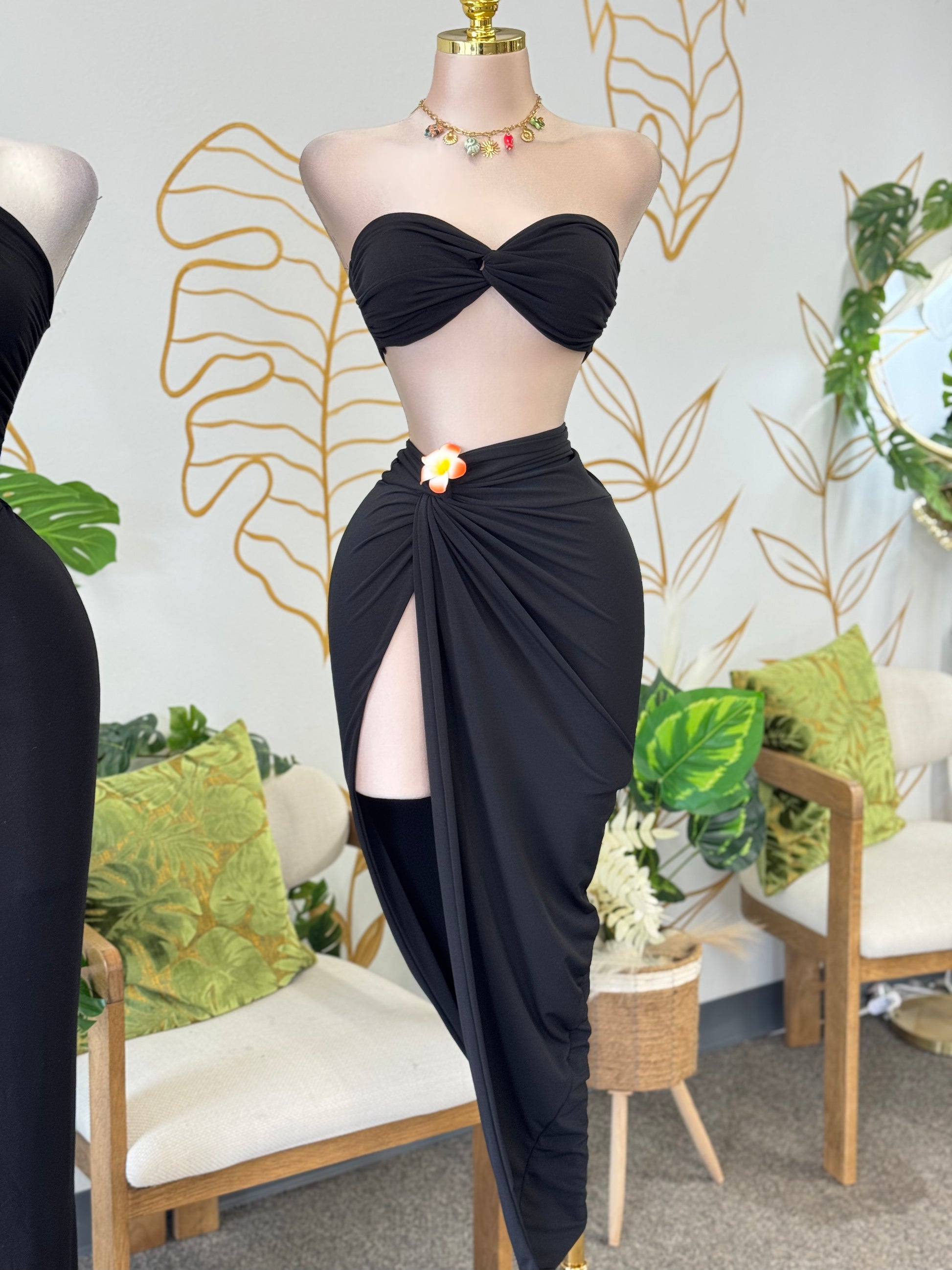 ¡Prepárate para brillar en tu próxima escapadita! 🏝️ Este set incluye un top tipo bandeau y una falda drapeada con abertura alta que estiliza tu figura. Disponible en dos colores hermosos: