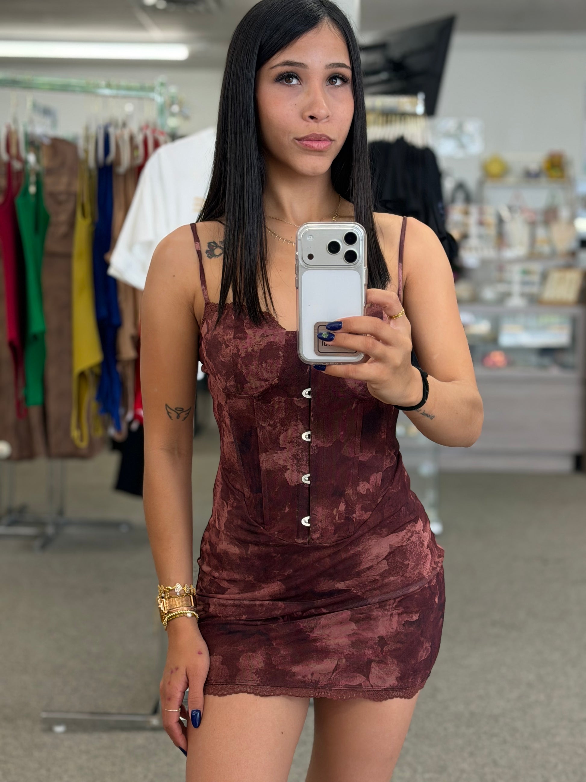 Vestido corto en tono chocolate con detalle frontal tipo corset, encaje delicado y tirantes finos. Tela suave cómoda y strech. Ajuste ceñido que resalta la silueta, ideal para una noche especial con un vibe sexy y sofisticado. 🤎💫✨