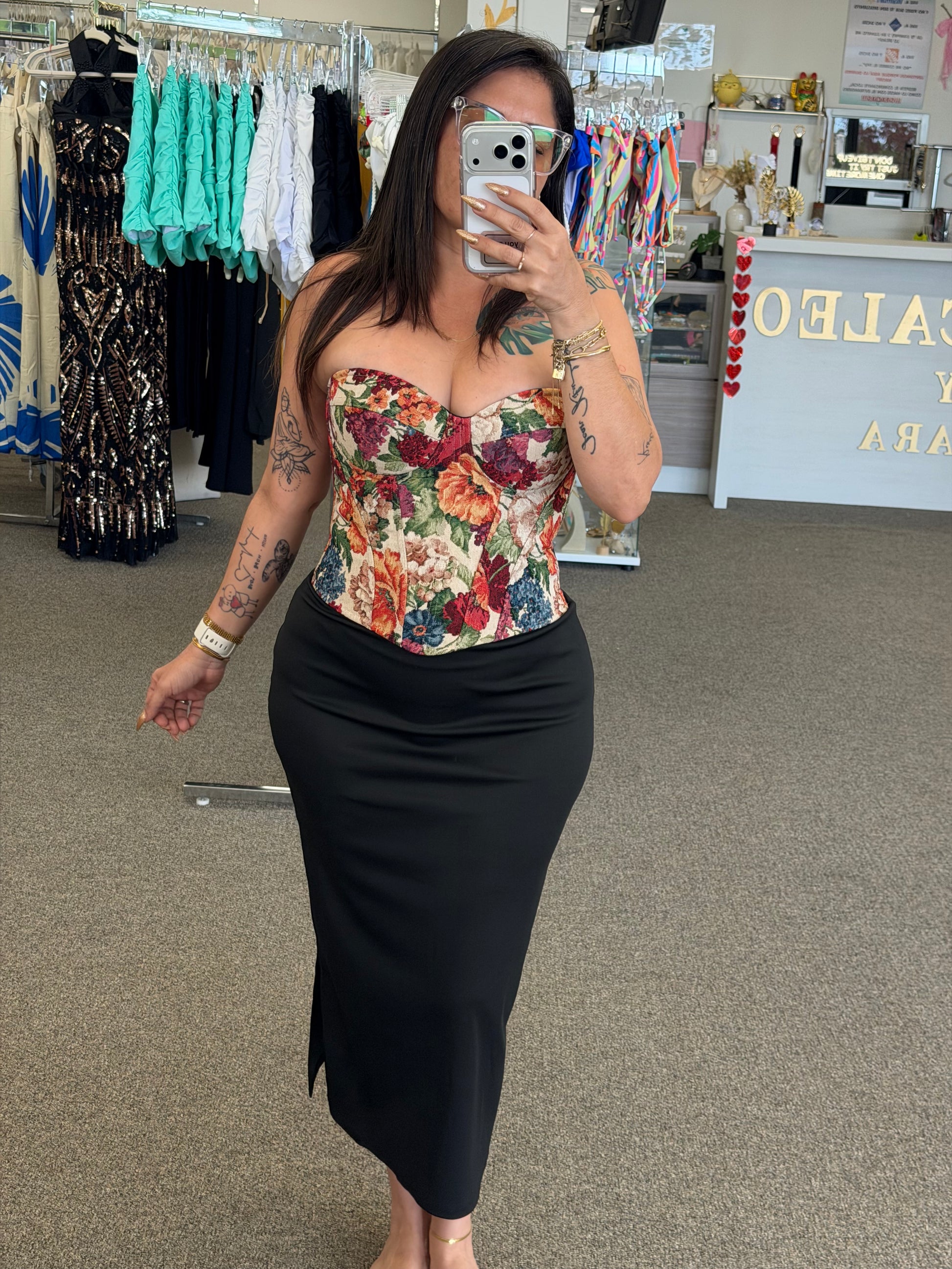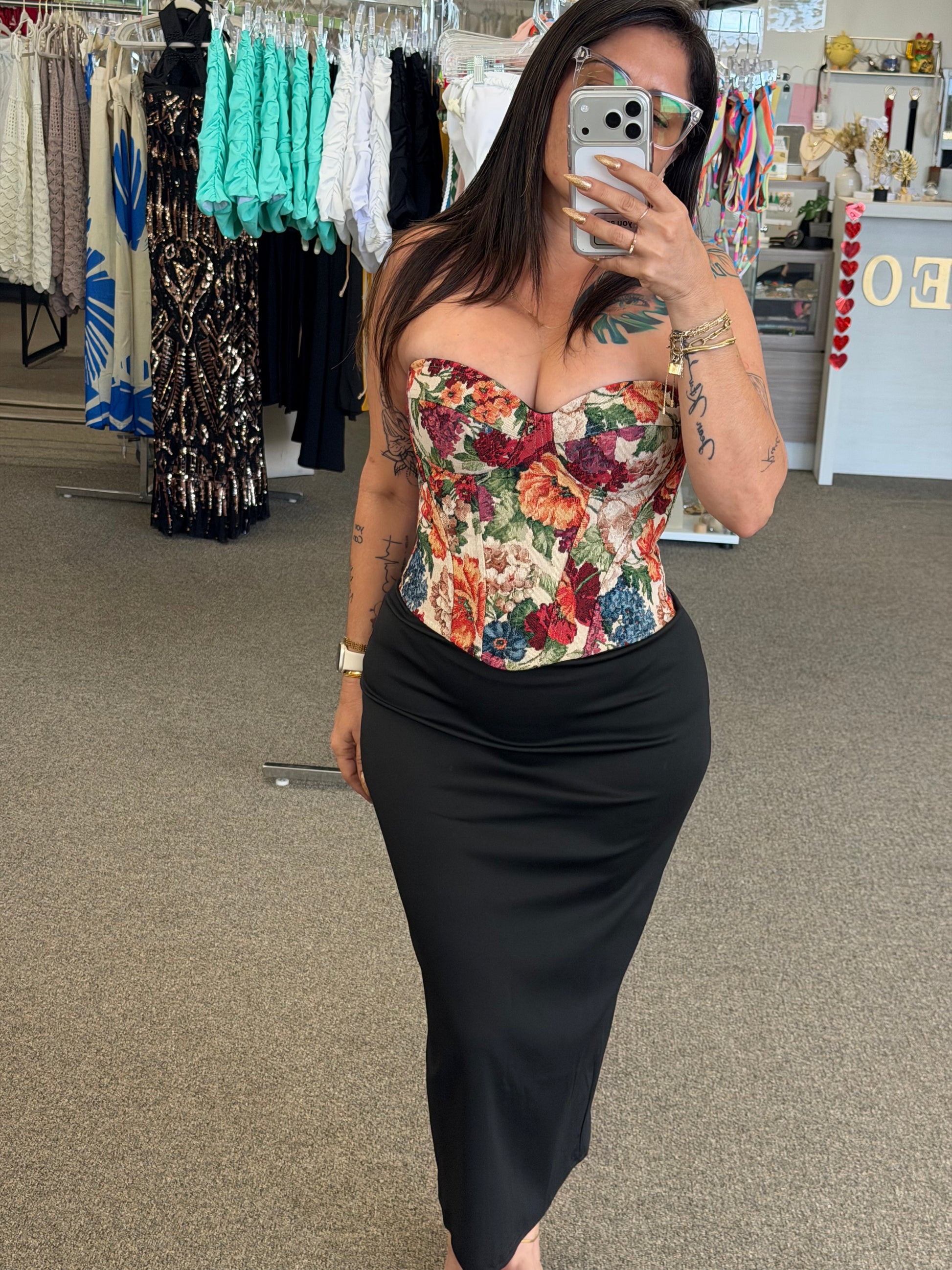 Este corset estilo bustier destaca por su hermoso estampado floral tipo tapestry, que le da un aire romántico, elegante y súper femenino. Su diseño estructurado ayuda a definir la cintura y resaltar la silueta, creando un look sofisticado y llamativo.