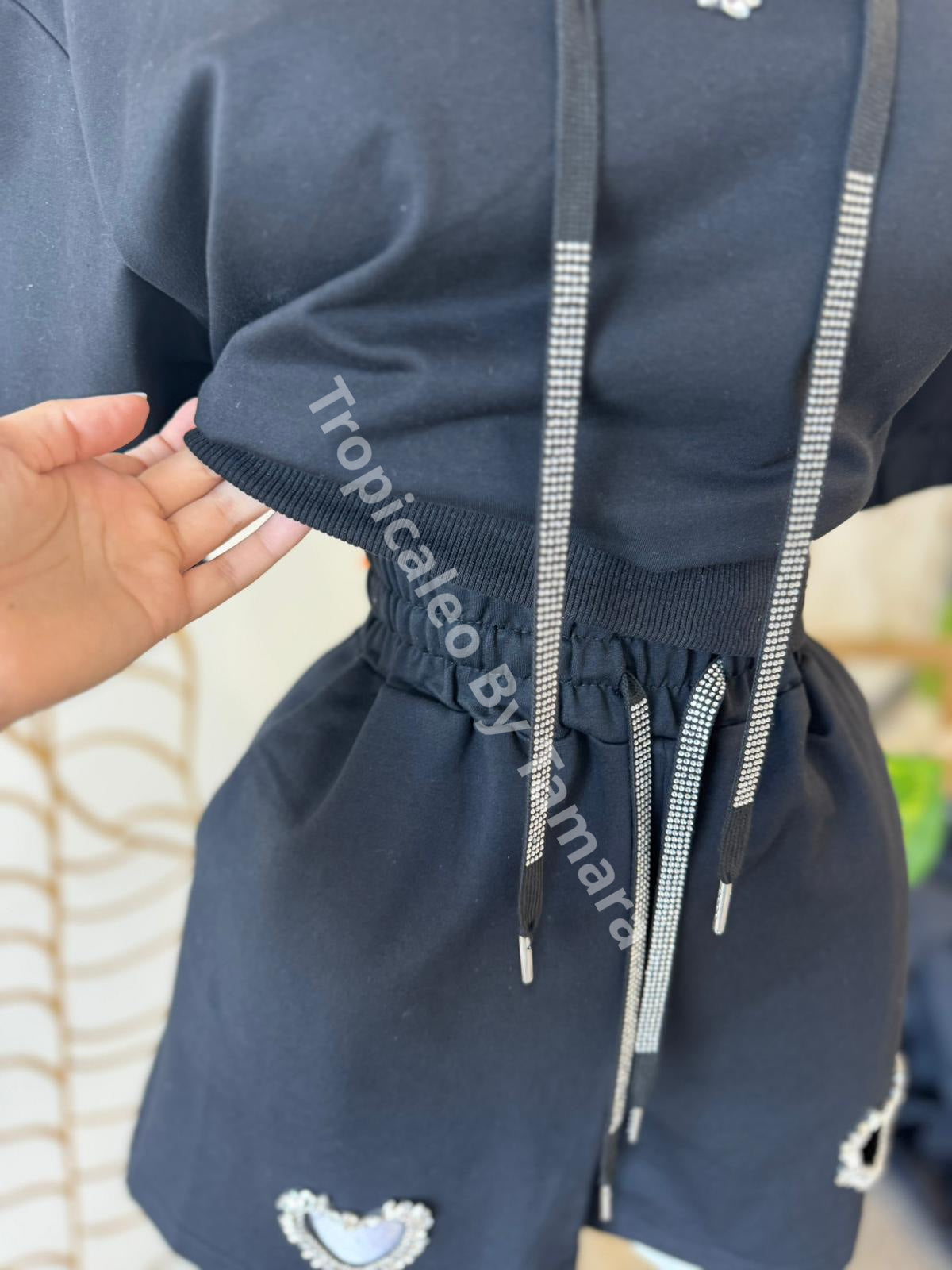 Set en negro 🖤 Incluye hoodie crop top con capucha y shorts super cómodos. Detalles en cristales brillantes y apertura en forma de corazón que le dan ese toque único ✨. La tela es suavecita y fresca.