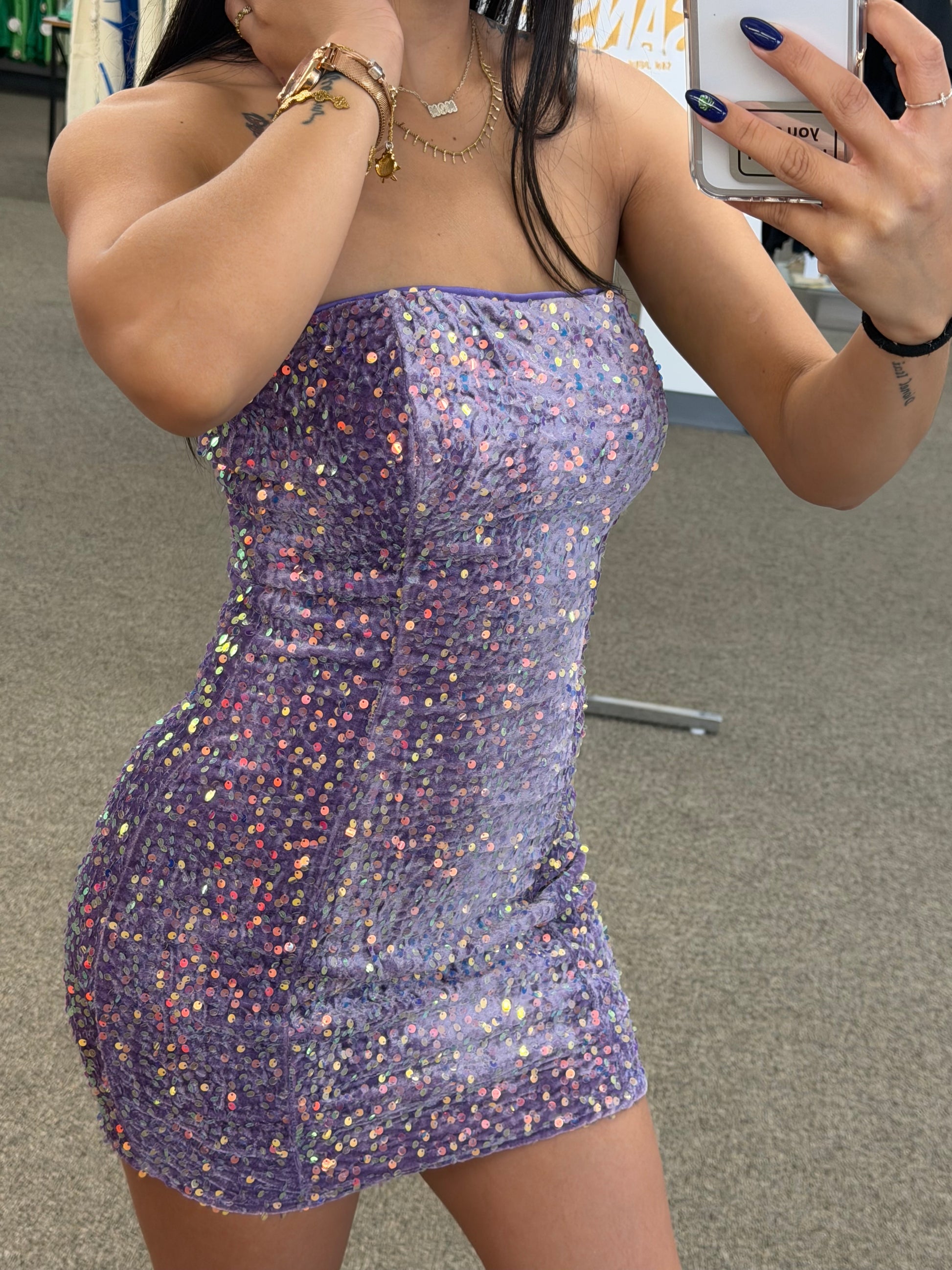 Vestido strapless en tono lila con lentejuelas iridiscentes que capturan la luz desde cualquier ángulo. Su diseño ajustado realza la silueta y lo convierte en la pieza perfecta para robar miradas. Ideal para noches de fiesta, eventos especiales o cualquier ocasión donde quieras brillar sin esfuerzo. 💜✨