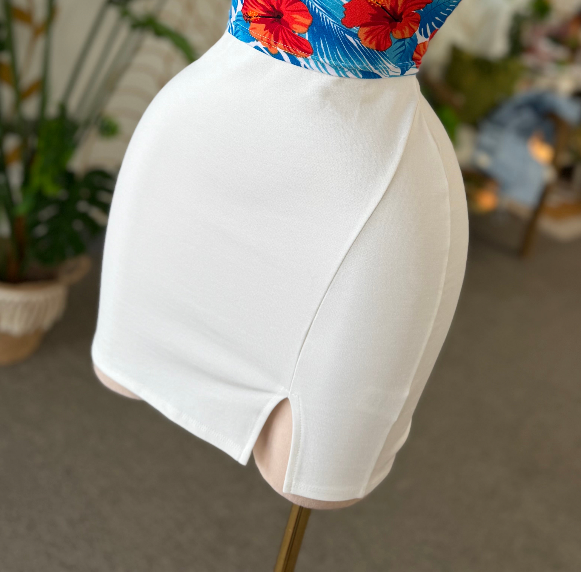 Falda corta en tono blanco marfil con diseño moderno y femenino. Su corte ajustado realza la silueta, mientras la abertura frontal añade un toque sexy y sofisticado. Confeccionada en tela suave y elástica que se adapta cómodamente al cuerpo, es ideal para crear looks tanto casuales como elegantes.