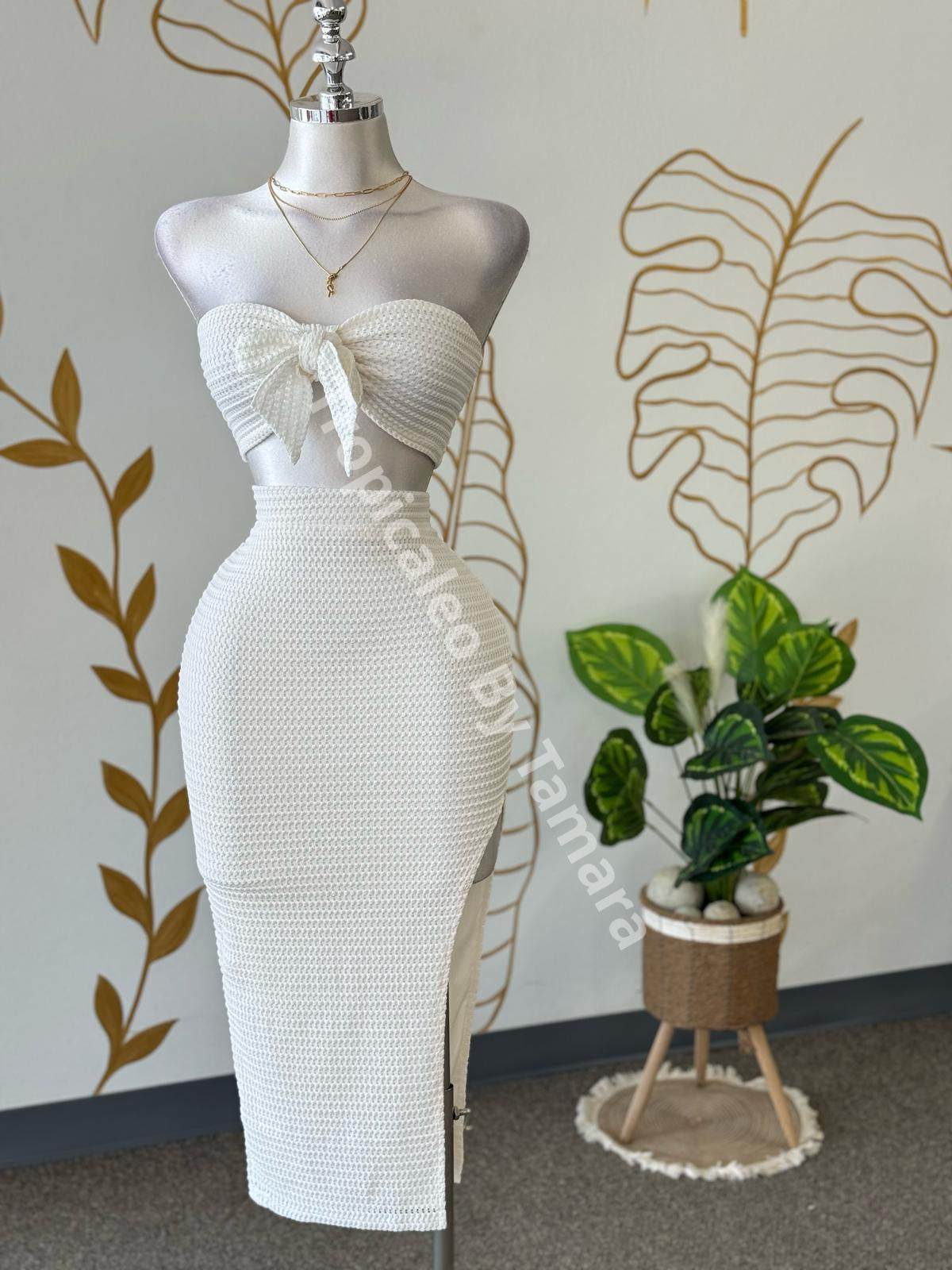 ¡Rompe con este set! Conjunto de dos piezas, crop top y falda. El top con detalle de lazo al frente y la falda larga con abertura lateral te dan un look espectacular. El tejido con textura (knit) se ajusta divinamente a tus curvas.