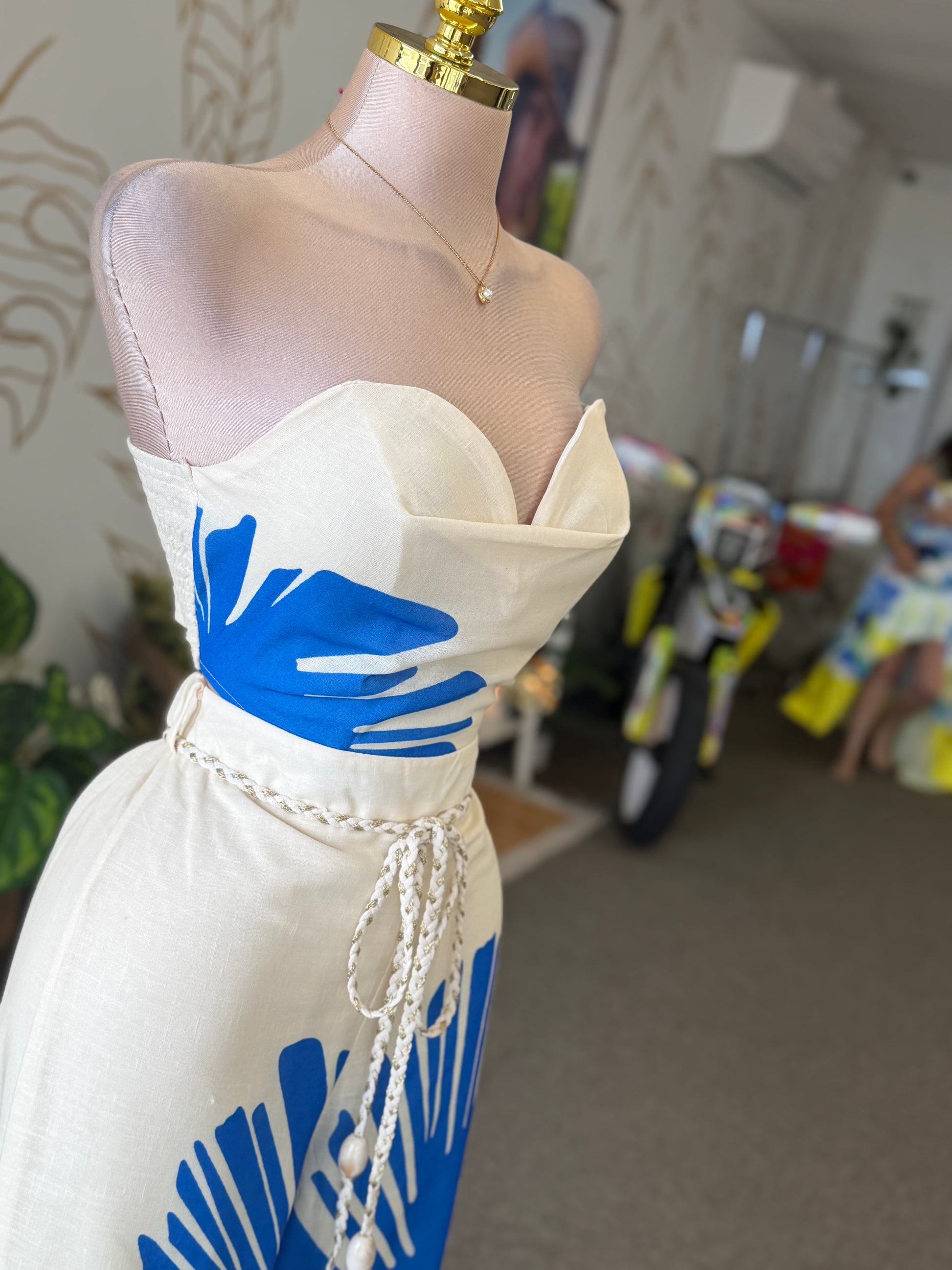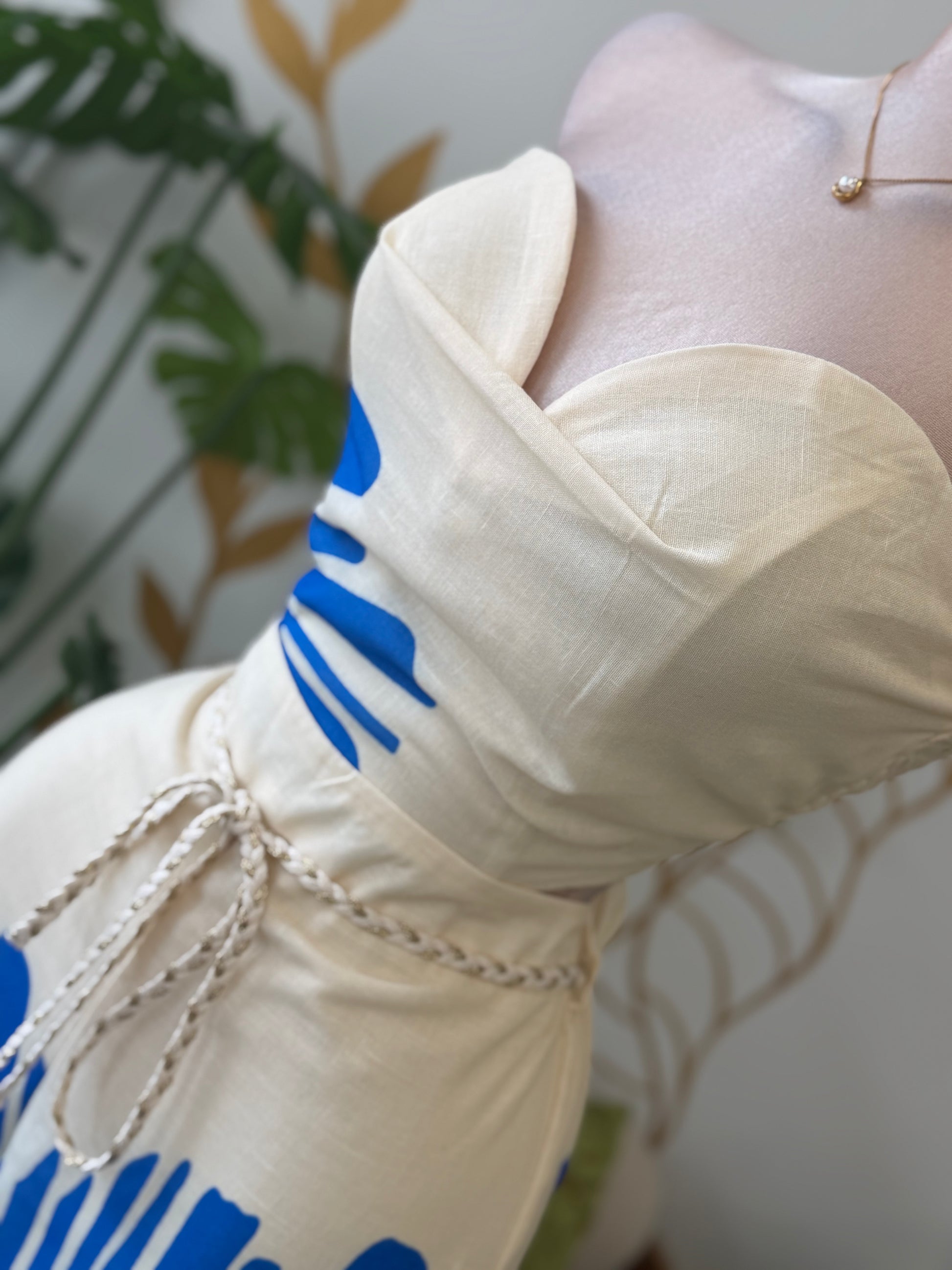 •Vestido strapless en tono marfil con estampado azul inspirado en hojas tropicales. Su diseño realza la silueta con un escote corazón estructurado y una falda fluida que aporta movimiento y frescura. Incluye cinturón trenzado ajustable que define la cintura y añade un toque artesanal. Ideal para eventos de día, brunch, vacaciones o una ocasión especial bajo el sol. Un vestido que se siente ligero, femenino y sofisticado a la vez. 💙🌀🌊✨